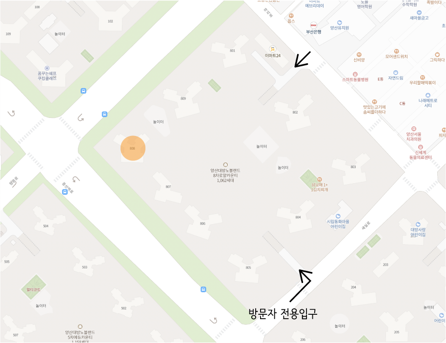 차량이용시 그림에 표시된 방문자 전용입구 이용 부탁드립니다.